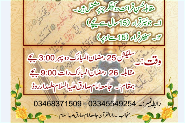 به گزارش ایکنا از پاکستان؛ این مسابقات ویژه جوانان و نوجوانان بوده و در شب بیست و ششم رمضان(11 خردادماه) که از شبهای قدر در میان مسلمانان است، برگزار میشود.
