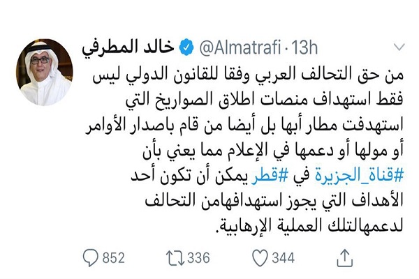 به گزارش ایکنا به نقل از الجزیره؛ «خالد المطرفی»، روزنامه‌نگار عربستانی در یک رشته توییت حمله ائتلاف تحت رهبری عربستان به شبکه خبری الجزیره را خواستار شده بود.