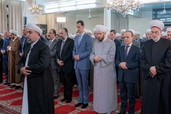 سانا»؛ بشار اسد، رئیسجمهور سوریه، امروز در میان جمع کثیری از نمازگزاران عید قربان، در مسجد جامع «الأفرم» دمشق حضور یافت و نماز عید قربان را اقامه کرد.
