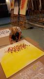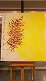 «باربارا گالیسنکا» بانوی خوشنویس لهستانی در حال نوشتن ترجمه «باز این چه شورش است که در خلق عالم است» در حاشیه تابلوی هنرمند ایرانی