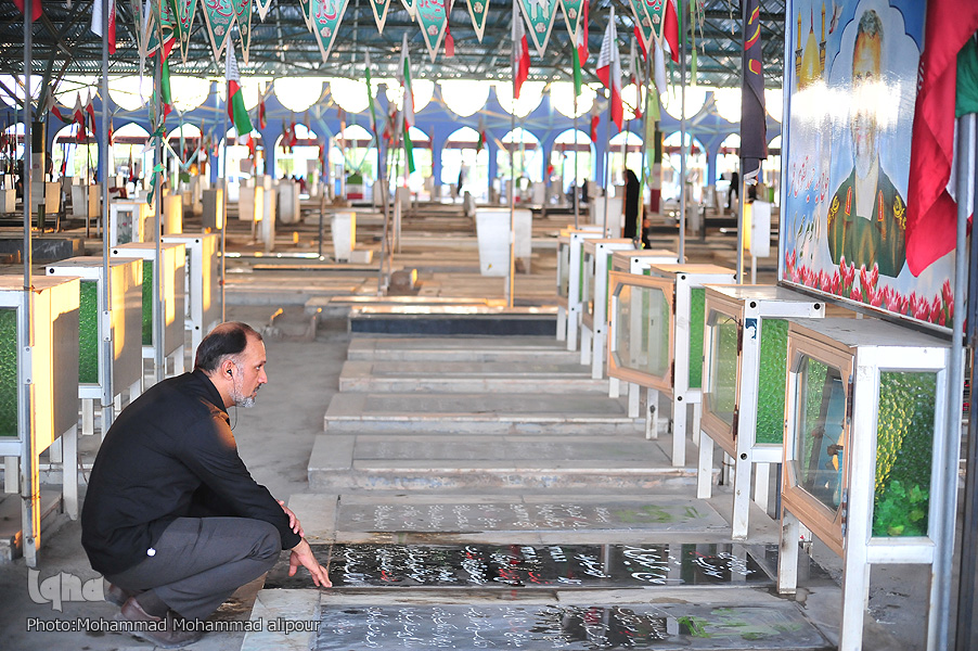 به هرطرف نگاه میکنم مادر شهید، همسر و یا فرزند شهید بر روی مزاری نشسته فاتحه، دعا و قرآن میخواند. گویی همین دیروز شهیدشان را آوردهاند یا اصلاً هنوز جنگ تمام نشده است. در و دیوار اهواز هنوز یادآور دفاع مقدس است.