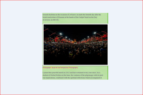 در این مقاله به موضوع حضور اقشار گوناگون از سنین مختلف و از ملیتهای متفاوت در مراسم اربعین و همچنین میهماننوازی عراقیها برای خدمت به زائران اربعین اشاره شده و نویسنده در آن فضای عمومی و حال و هوای حاکم بر این اجتماع بزرگ را الهام گرفته از روح والای امام حسین(ع)، موضوع کربلا و شخصیتهایی دانسته است که در این حادثه نقشآفرینی کردند.