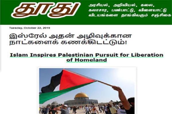 به گزارش ایکنا؛ به نقل از سازمان فرهنگ و ارتباطات اسلامی، با همکاری رایزنی فرهنگی ایران در سریلانکا، وبلاگ تامیل‌زبان «تودو» (thoothu) اقدام به انتشار مقاله‌ «اسلام الهام‌بخش، تلاش برای آزادی فلسطین» کرده است.