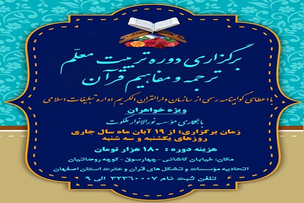 به گزارش ایکنا؛ اتحادیه مؤسسات و تشکلهای قرآن وعترت استان اصفهان، برای نخستین بار، دوره تربیت معلم ترجمه و مفاهیم قرآن را ویژه بانوان در سطح استان اصفهان برگزار میکند.