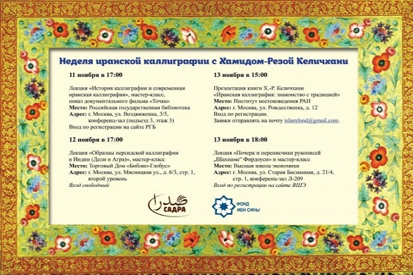 فردا، 23 آبان نیز مدرسه عالی اقتصاد مسکو میزبان هفته خوشنویسی اسلامی ایرانی خواهد بود و در این برنامه سخنرانی حمیدرضا قلیچ خانی با موضوع خط و کاتبان نسخههای خطی شاهنامه به همراه کارگاه آموزشی ارائه میشود.