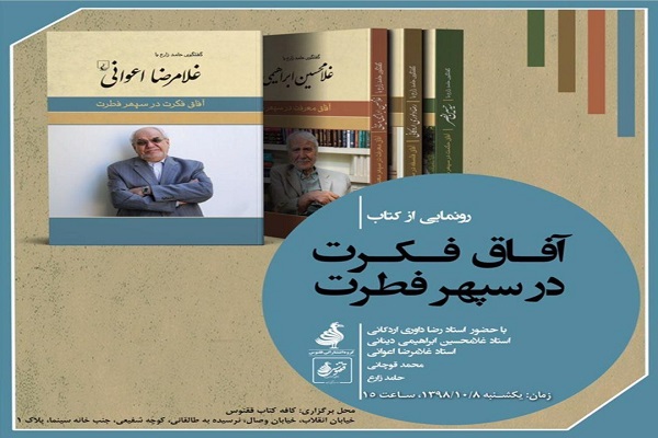 ایکنا؛ مراسم رونمایی از کتاب «آفاق فکرت در سپهر فطرت» نوشته غلامرضا اعوانی، یکشنبه، 8 دیماه، از ساعت 15 واقع در خیابان انقلاب، خیابان وصال، خیابان طالقانی، کوچه شفیعی، جنب خانه سینما، پلاک 1 برگزار میشود.