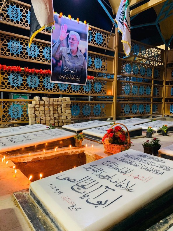 در این مراسم شهروندان عراقی با شعار «الله اکبر/ آمریکا الشیطان الاکبر» و «یا ابومهدی یا قاسم؛ الثأر قادم قادم (ای ابومهدی ای قاسم؛ انتقام نزدیک است نزدیک)» به دستهای بریده حضرت قاسم(ع) سوگند یاد کردند که خون ابومهدی پایمال نخواهد شد.