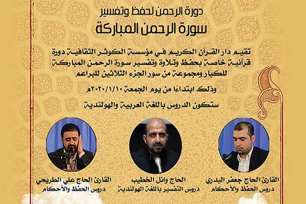 الکوثر»، این دوره به همت دارالقرآن وابسته به مؤسسه فرهنگی «الکوثر» در شهر لاهه هلند در حال برگزاری است و در آن حفظ، تلاوت و تفسیر سوره مبارکه «الرحمن» به بزرگسالان آموزش داده میشود.