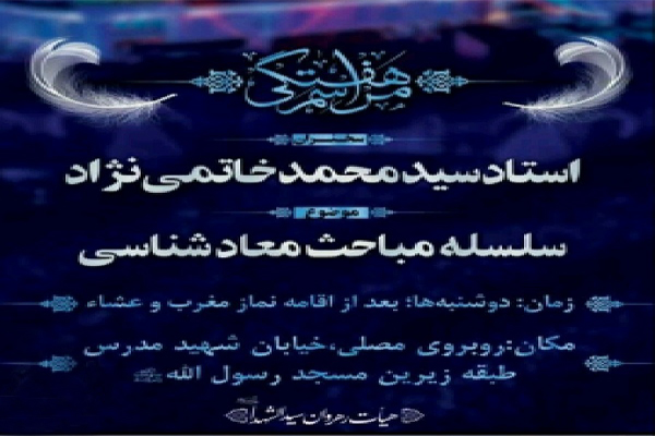 به گزارش کانون خبرنگاران ایکنا، نبأ؛ به همت هیئت رهروان سیدالشهدای اراک سلسله مباحث معادشناسی، روزهای دوشنبه، پس از اقامه نماز مغرب و عشا برگزار می‌شود.