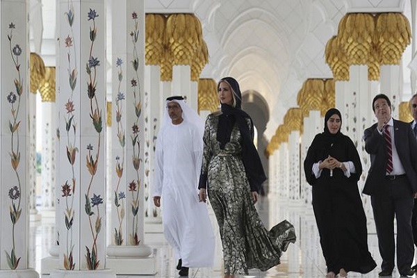 indy100، ایوانکا، دختر و مشاور ویژه ترامپ، روز شنبه برای شرکت در مجمع جهانی زنان در دبی و همچنین ملاقات با شیخ محمد بن زاید آل نهیان ولیعهد، وارد امارات متحده عربی شد. وی در این سفر در حالی که روسری بر سر داشت، از مسجد شیخ زاید در ابوظبی دیدار کرد. این اقدام ایوانکا واکنشهای مختلفی را در بین کاربران فضای مجازی برانگیخت.