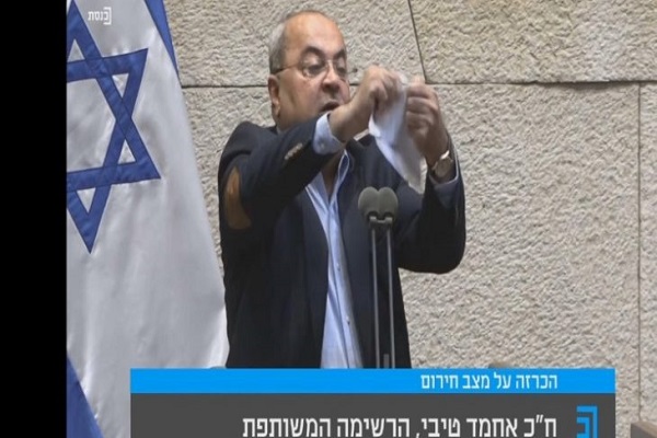 القدس العربی، احمد الطیبی که ریاست فراکسیون لیست مشترک عربی در کنست را برعهده دارد، در اعتراض به کمپین تحریک بنیامین نتانیاهو، نخستوزیر رژیم صهیونیستی علیه لیست مشترک عربی، نسخه طرح ضد فلسطینی معامله قرن را در جلسه پارلمان پاره و آن را لگدمال کرد و در اظهاراتی گفت که سرنوشت این طرح لگدمال شده است.
