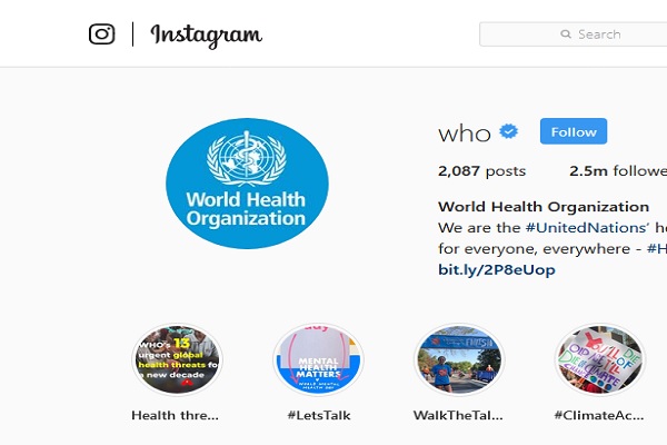 در یکی از پست‌های اینستاگرام این سازمان آمده است: برای سالم ماندن در محل کار، دست‌های خود را مرتباً بشویید؛ جلوی عطسه و سرفه خود را با دستمال یا با آرنج خود بگیرید و دستمال آلوده را سریعاً در سطل زباله بیندازید و بعد از آن فوراً دست‌های خود را بشویید.