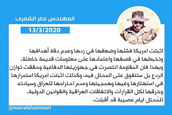 به گزارش ایکنا؛ به نقل از مرکز ارتباطات و امور رسانهای نُجَباء در ایران، نصر الشمری، سخنگوی مقاومت اسلامی نُجَباء در صفحه شخصی خود در توئیتر با اشاره به ناکامی آمریکا در حملات اخیر خود نوشت: پاسخ آمریکا نشانگر عدم دقت در هدفیابی و همچنین بمباران هوایی بر پایه اطلاعات قدیمی و اشتباه بوده است.
