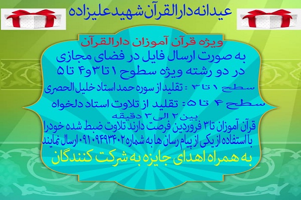 عیدانه دارالقرآن شهید علیزاده به مناسبت فرا رسیدن سال نو و با هدف انس با قرآن و ارتقای سطح قرآنآموزان دارالقرآن در ایام نوروز، به صورت مجازی و با محوریت آموزش روخوانی، حفظ و قرائت تقلیدی برگزار و به تمامی شرکتکنندگان در این برنامهها نیز جوایزی اهدا میشود.