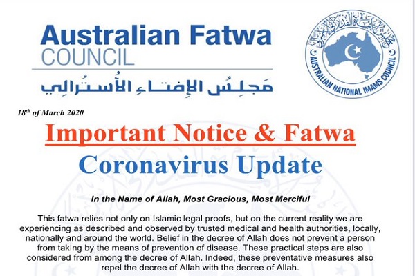 اس بی اس، شورای ملی ائمه جماعت استرالیا (ANIC)، بزرگترین نماینده مسلمانان و امامان جماعت در این کشور روز دوشنبه جلسهای برای بحث و گفتوگو درباره اقدامات پیشگیرانه در مساجد و مراکز اسلامی برگزار کرد. این شورا روز چهارشنبه با صدور فتوایی از مسلمانان خواست در منازل خود نماز بخوانند و برای نمازهای جمعه به مساجد نیایند.