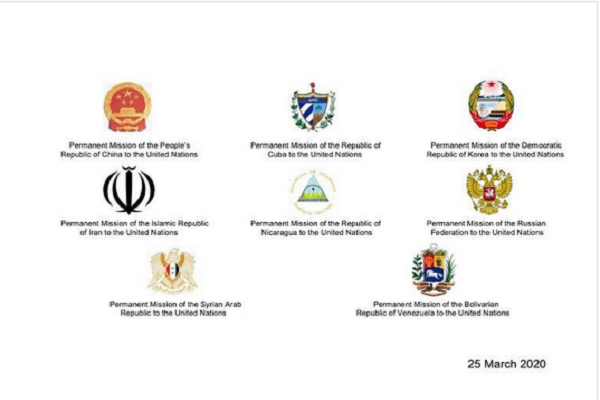 هشت کشور عضو سازمان ملل متحد با تأکید بر اینکه کووید-۱۹ دشمن مشترک همه است، تصریح کردند: همه می‌دانیم که در این زمان تاریخی باید بیشترین همبستگی، همکاری و همیاری وجود داشته باشد و این کار برای کشورهایی که در حال حاضر با اقدامات قهریه یک‌جانبه، که غیرقانونی و آشکارا نقض قوانین بین‌المللی و منشور سازمان ملل است، روبرو هستند، اگرچه غیرممکن نیست، اما سخت است.