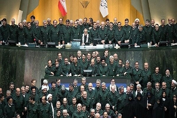 ۲- دو روز بعد، همه نمایندگان مجلس در واکنش به اقدام دولت آمریکا در قرار دادن سپاه پاسداران در لیست گروههای تروریستی، لباس فرم سپاه پاسداران را به تن کردند و یک صدا سرود جمهوری اسلامی ایران را خواندند و پس از آن فریاد مرگ بر آمریکا سر دادند.
