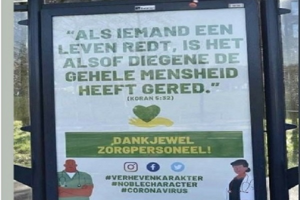 به گزارش ایکنا؛ در بیرون از محوطه ساختمان بیمارستانی در آمستردام پایتخت هلند، بیلبوردی نصب شده که در آن بخشی از آیه 32 سوره مائده نقش بسته است: «هر كس كسى را زنده بدارد، چنان است كه گويى تمام مردم را زنده داشته است».