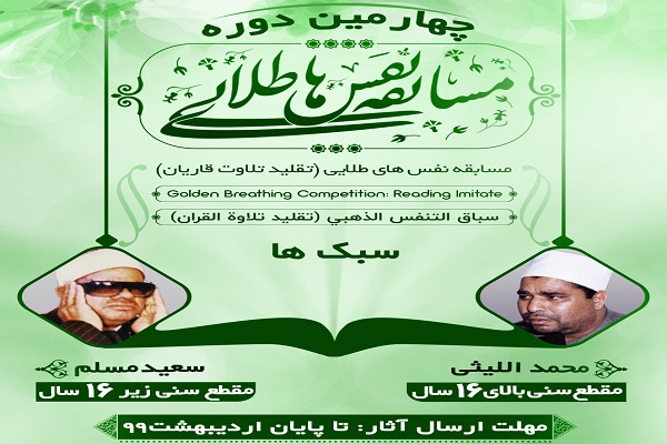 دوره چهارم مسابقه نفسهای طلایی در دو سبک استاد محمد اللیثی و سعید مسلم در حال برگزاری است و علاقهمندان تا پایان اردیبهشتماه فرصت دارند که تلاوتهای خود را از طریق وبسایت شبکه رادیویی قرآن ارسال کنند.