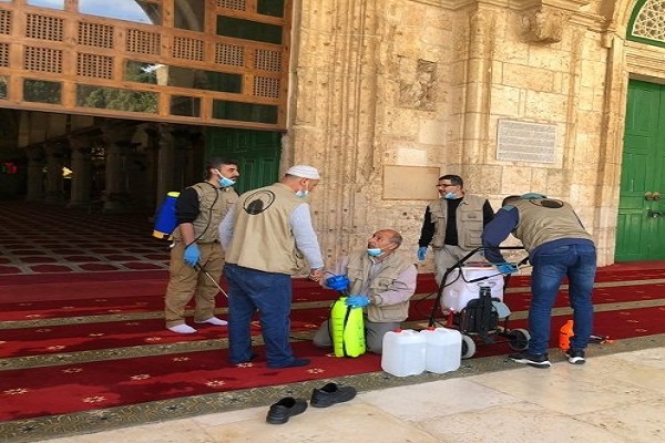 بر اساس این گزارش، کارکنان اداره اوقاف اسلامی فلسطین با استفاده از مواد ضد عفونی، به نظافت مسجد الاقصی و محوطه آن پرداختند و برای رعایت فاصله بین نمازگزاران، دستورالعملهای بهداشتی را روی دیوارها نصب کردند.