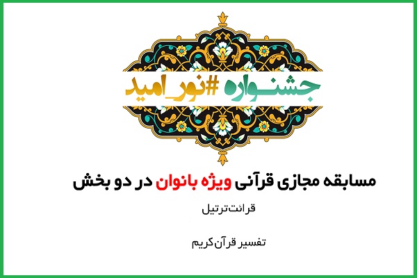 به گزاش ایکنا، جشنواره مجازی #نور_امید ویژه بانوان در رشته قرائت ترتیل با محوریت آیات ۱۷ سوره مبارکه انعام، ۱۰۷ سوره مبارکه یونس، ۸۷ و ۸۸ سوره مبارکه انبیاء و ۷۷ سوره مبارکه فرقان و تفسیر قرآن با محوریت سوره مبارکه نور و در دو گروه سنی زیر ۱۵ سال و بالای ۱۵ سال و با دبیری شیبا رحمانیمنش برگزار میشود.