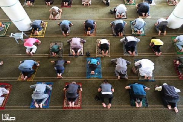 با بازگشایی مساجد در غزه نمازگزاران شهر رفح با رعایت فاصله اجتماعی نماز خواندند.