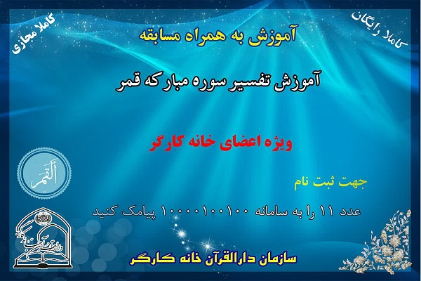 به گزارش ایکنا؛ دارالقرآن خانه کارگر در نظر دارد تا برنامه آموزش به همراه مسابقه با محوریت تفسیر سوره مبارکه قمر را ویژه کارگران سراسر کشور برگزار کند.