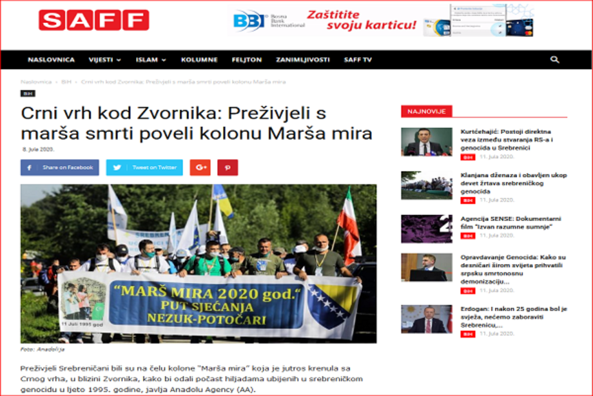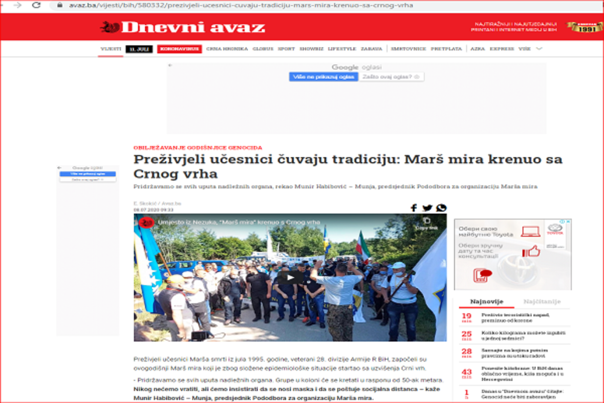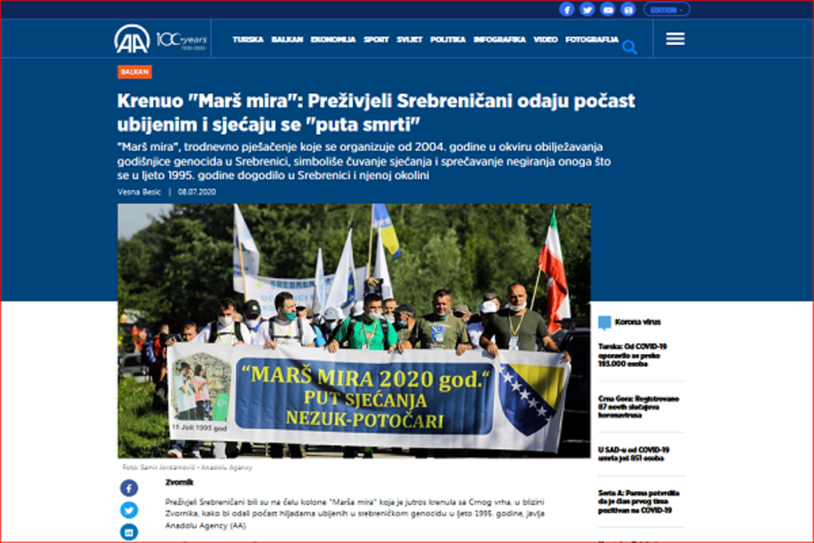 به گزارش ایکنا از سارایوو، امسال به دلیل شیوع کرونا راهپیمایی مارش میرا با محدودیتهای فراوان و تدابیر بهداشتی برگزار شد و بازماندگان نسلکشی مسلمانان در سربرنیتسا، خانوادههای شهدا، ایرانیان مقیم و فعالان فرهنگی در آن حضور یافتند.