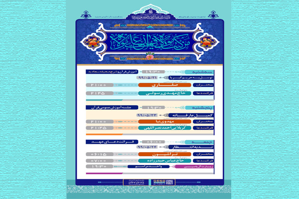 جلسه آموزش عمومی قرآن از ساعت 19:30، سخنرانی حجتالاسلاموالمسلمین مهدوینیا، کارشناس مذهبی ساعت ۲۱ و قرائت دعای کمیل با نوای احمد نصراللهی، ساعت 21:45 از برنامههای روز پنجشنبه، 23 مردادماه در این مسجد مقدس بهشمار میرود.