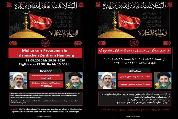 حجج اسلام حیدری و موسوی سخنرانان مراسم عزاداری حسینی در هامبورگ هستند و شرکت افراد دارای سابقه بیماری در این برنامه ممنوع است.