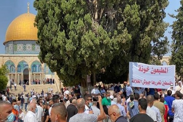 هزاران فلسطینی پس از اقامه نماز جمعه در مسجد الاقصی، عادی‌سازی روابط بحرین و امارات با رژیم صهیونیستی را محکوم کردند.