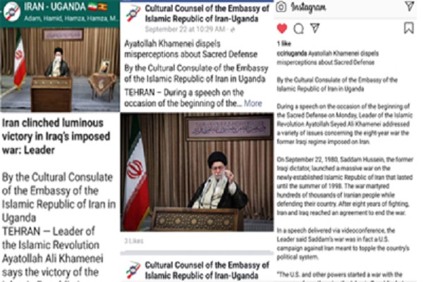 در دو اقدام جداگانه دیگر نیز فرازهايی از سخنان مقام معظم رهبری(مدظله العالی) در آغاز هفته دفاع مقدس به همراه توضیح علل وقوع جنگ تحمیلی در دومین روز این هفته از سوی «آدم سبیالا»، استاد دانشگاه و فعال رسانهای و «حمزه چیونه»، شخصیت رسانهای در رادیو بلال اوگاندا تبیین شد.