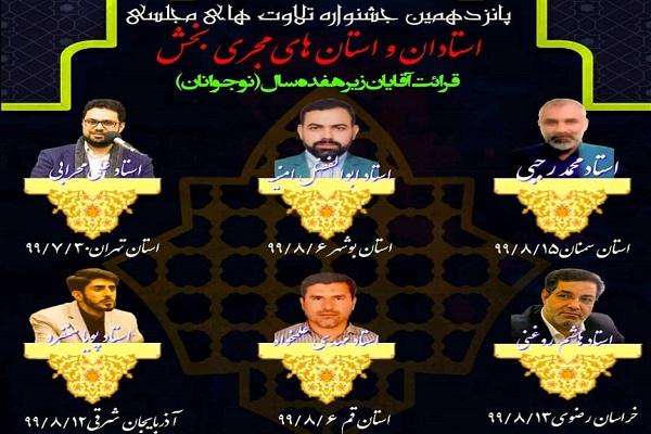 در استان قم نیز ️جلسه مهدی علمخواه طی ششم آبانماه در محل مسجد مقدس جمکران پذیرای علاقهمندان به شرکت در جشنواره خواهد بود. همچنین، ️جلسه ابوالفضل امینهبرازجانی در استان بوشهر نیز در همین روز و بعد از نماز مغرب و عشا در محل مسجد دلگشای این شهرستان میزبان نوجوانان علاقهمند به حضور در جشنواره تلاوتهای مجلسی خواهد بود.