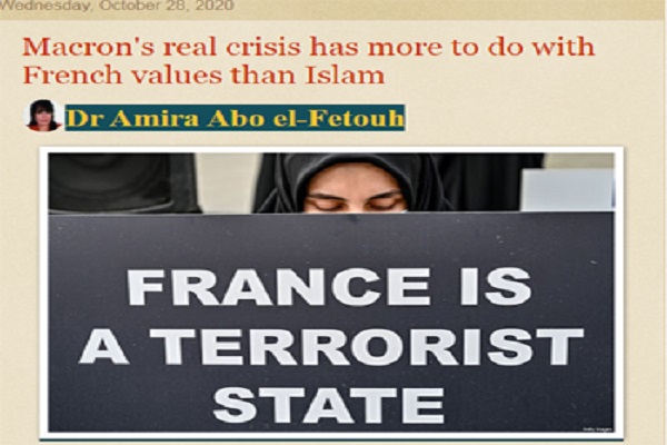 همچنین در این مقاله تأکید شده است: ماکرون دوباره مسلمانان جهان را به چالش کشید و تکرار کرد که کاریکاتورها را مجدداً منتشر خواهد کرد، او مصمم است مسلمانان را تحقیر کرده و مردم را علیه آنها در فرانسه و احتمالاً در سایر نقاط تحریک و یک فضای خصمانه نسبت به آنها ایجاد کند.