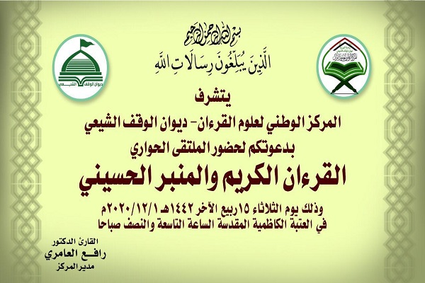 نشست گفت‌وگو محور «قرآن کریم و منبر حسینی» از سوی مرکز ملی علوم قرآن وابسته به دیوان اوقاف شیعیان عراق، در آستان مقدس کاظمی(ع) در شهر کاظمین برگزار می‌شود.