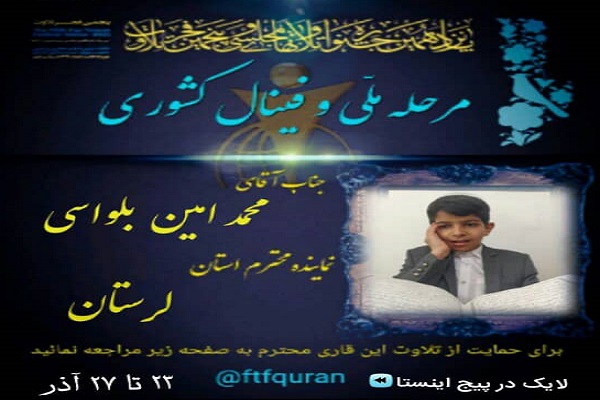 به گزارش ایکنا، محمدامین بلواسی، نوجوان 11ساله، ساکن روستای سیاهپوش شهرستان الشتر استان لرستان است که به دلیل علاقهمندی و استعداد ذاتی، به عرصه قرائت قرآن راه پیدا کرد. وی قرائت قرآن را از مؤسسه قرآنی مشکات الشتر آغاز کرد و سپس به عرصه تخصصی ورود پیدا کرد.