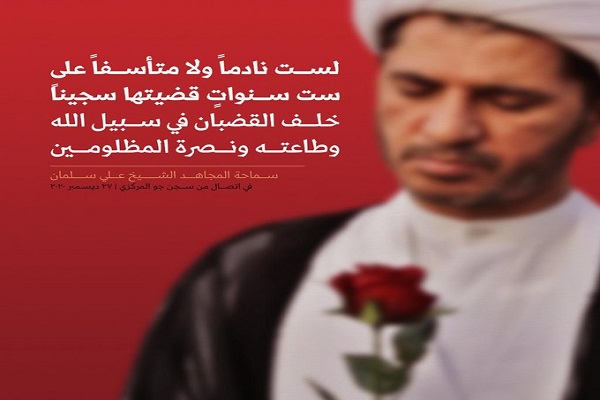شیخ سلمان در این پیام میگوید: از اینکه تاکنون در راه خدا و اطاعت او و یاری مظلومان شش سال پشت میلههای زندان گذراندهام، تأسف نمیخورم و پشیمان نیستم.