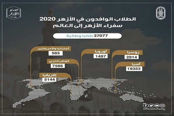 در مجموع در سال گذشته میلادی(2020) الازهر میزبان 37077 طلبه دختر و پسر از دیگر کشورهای جهان بوده است. در همین راستا صفحه فیسبوک الازهر تصویری را که نشان دهنده توزیع جغرافیایی این دانشجویان است، به اشتراک گذاشت.