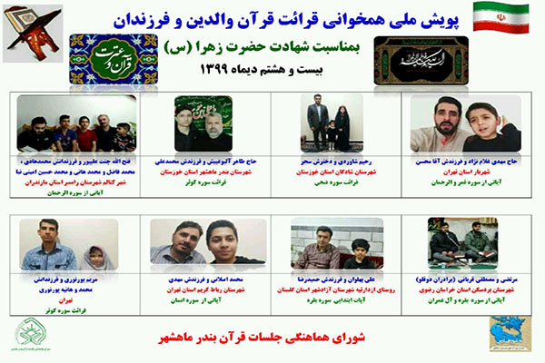 به گزارش خبرنگار افتخاری ایکنا، به همت شورای هماهنگی جلسات قرآن بندر ماهشهر پویش ملی همخوانی قرائت قرآن والدین و فرزندان بهمناسبت شهادت حضرت فاطمه زهرا(س) با همکاری مهدی غلامنژاد، قاری بینالمللی کشورمان و شرکت 16 خانواده از سراسر کشور در فضای مجازی برگزار شد.