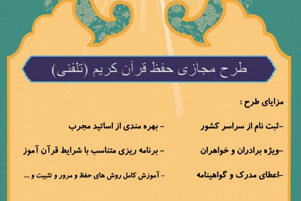 به گزارش ایکنا، ثبت نام کلاسهای مجازی حفظ قرآن کریم به صورت تلفنی از سوی دارالقرآنالکریم نور شهرستان جغتای آغاز شد.