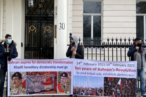به گزارش ایکنا؛ به نقل از العالم، دهها نفر از فعالان و بحرینیهای مقیم انگلیس روز یکشنبه همزمان با دهمین سالگرد قیام 14 فوریه، مقابل سفارت بحرین در لندن تظاهرات برگزار کردند.