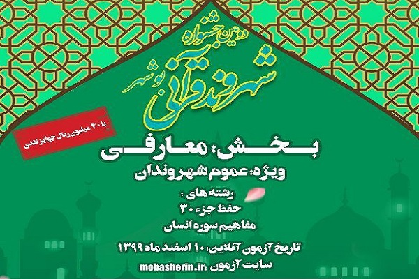 به گزارش ایکنا، آزمون بخش معارفی جشنواره شهروند قرآنی بوشهر، ۱۰ اسفند برگزار میشود، این جشنواره از سوی مؤسسه فرهنگی ـ ورزشی شهرداری بوشهر بهعنوان و مؤسسه فرهنگی ـ مردمی قرآن و عترت نورالثقلین بوشهر به عنوان مجری برگزار میشود.