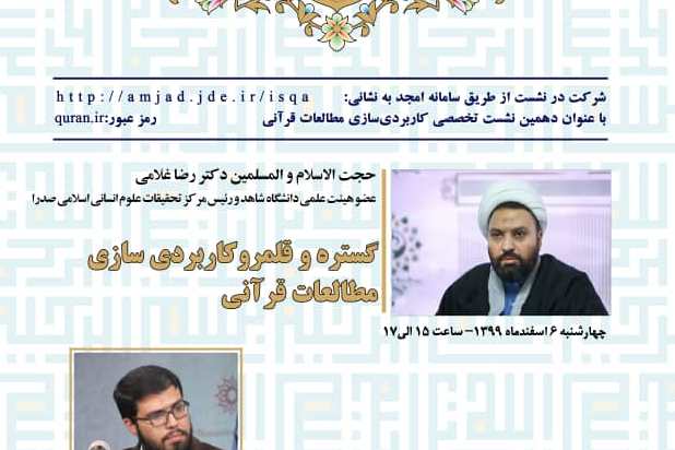 به گزارش ایکنا، سلسله نشستهای تخصصی «کاربردیسازی مطالعات قرآنی» این بار و در دهمین نشست خود به موضوع «گستره و قلمرو کاربردیسازی مطالعات قرآنی» اختصاص یافته و با حضور حجتالاسلام والمسلمین رضا غلامی، عضو هیئت علمی دانشگاه شاهد و رئیس مرکز تحقیقات علوم انسانی اسلامی صدرا برگزار میشود.