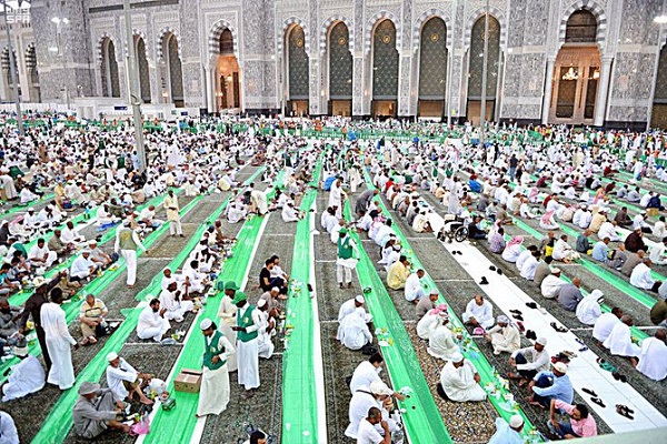 در این مکانها، هیچ زائری در ماه رمضان در هنگام افطار، گرسنه نمیماند. کارگران در صحن این مساجد، سفرههای یک بار مصرف پهن میکنند و غذای کافی برای تغذیه همه مؤمنان گذاشته میشود. خرما اولین غذای توصیه شده توسط حضرت محمد (ص)، لبن (شیر)، آب و یک وعده غذایی گرم که معمولاً شامل برنج و گوشت است در اختیار همه زائران گذاشته میشود.