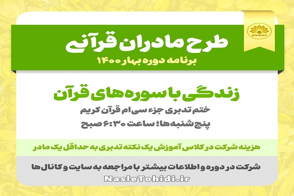 شرکت در جلسات با عضویت در کانال مادران قرآنی نسل توحیدی به نشانی ble.ir/MadaraneGhorani در پیامرسان بله، گروه واتساپ yun.ir/niqut8 و پایگاه اینترنتی nasletohidi.ir مقدور است.