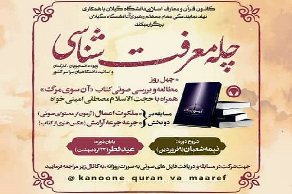 مسابقهای نیز از چله معرفتشناسی شامل دو بخش ملکوت اعمال از محتوای صوتی و جرعه جرعه آرامش با موضوع چالش عکسنوشته هنری برگزار میشود، زمان این چله از 9 فروردین مصادف با نیمه شعبان تا 23 اردیبهشتماه همزمان با عید فطر تعیین شده است.