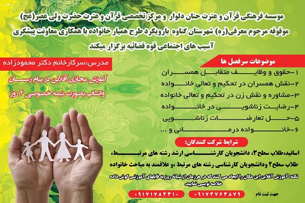 حقوق و وظایف متقابل همسران، نقش همسران در تحکیم و تعالی خانواده، مشاوره و نقش زن در تحکیم و تعالی خانواده، رضایت زناشویی در خانواده، حل تعارضات زناشویی، خانواده درمانی و ... از سرفصلهایی است که برای این طرح در نظر گرفته شده است.