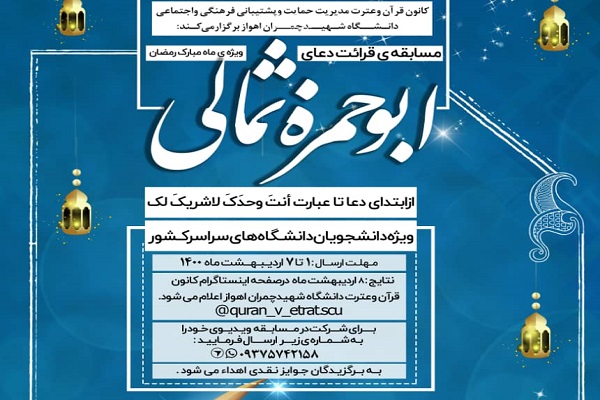 مسابقه قرائت دعای ابوحمزه ثمالی از سوی کانون قرآن و عترت دانشگاه شهید چمران اهواز برگزار می‌شود.
