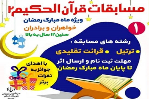 به گزارش ایکنا، مسابقات قرآن الحکیم از سوی مؤسسه فرهنگی قرآن و عترت نورالهادی خرمشهر با همکاری اداره آموزش و پرورش، اداره تبلیغات اسلامی و اداره فرهنگ و ارشاد اسلامی این شهرستان برگزار میشود.