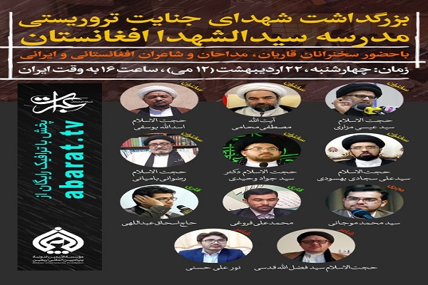 به گزارش ایکنا، مراسم بزرگداشت شهدای جنایت تروریستی مدرسه سیدالشهدای کابل، با حضور قاریان، مداحان و شاعران افغانستانی و ایرانی عصر چهارشنبه، 22 اردیبهشت، از سوی بنیاد بینالمللی اربعین برگزار و از طریق شبکه عبرات به شکل زنده پخش شد.